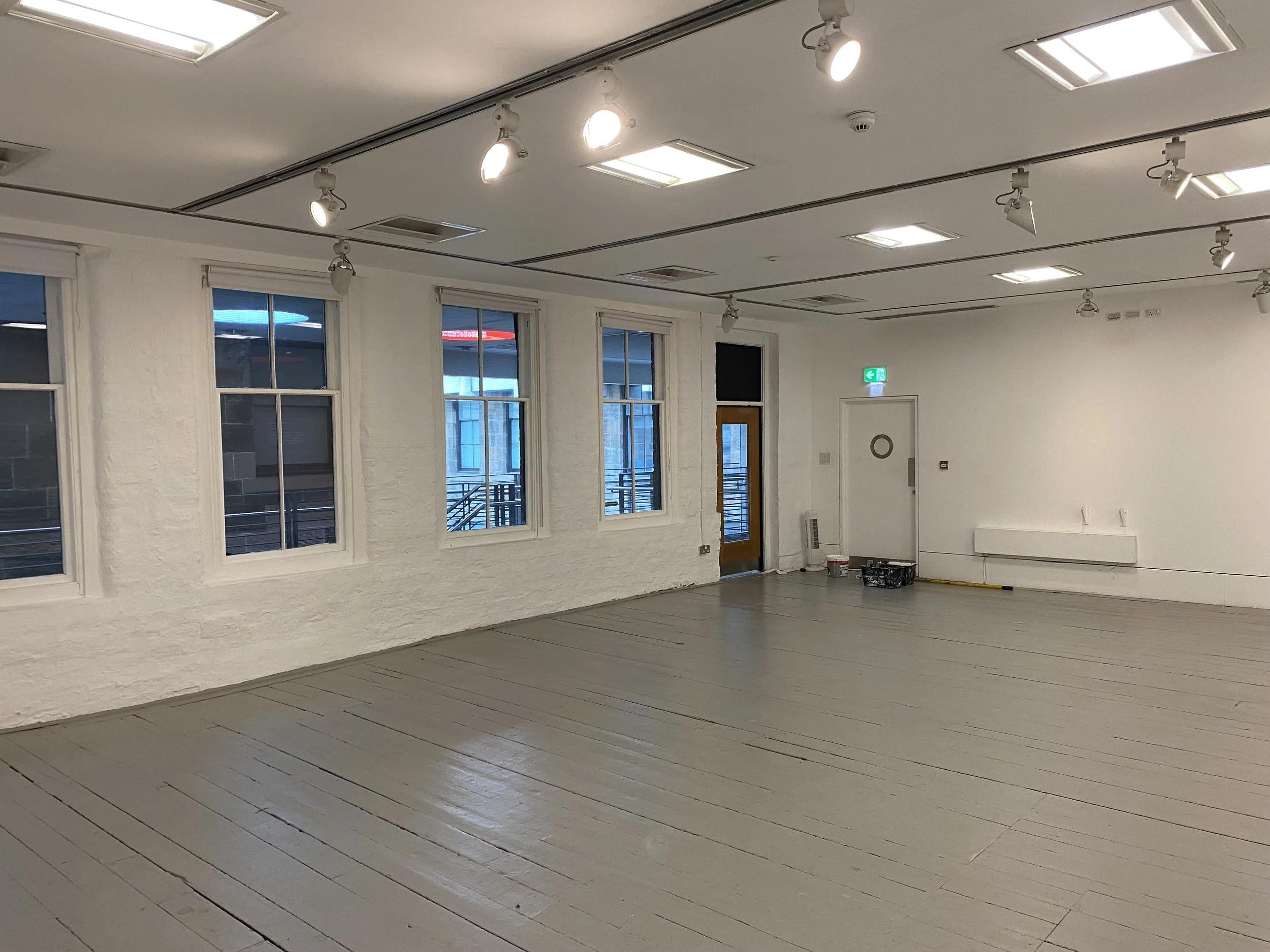 Description: Upstairs space used as a gallery. Windows are able to be partially blacked out however the centre row of lights always remain dim as they are emergency lights so full blackout is not possible.