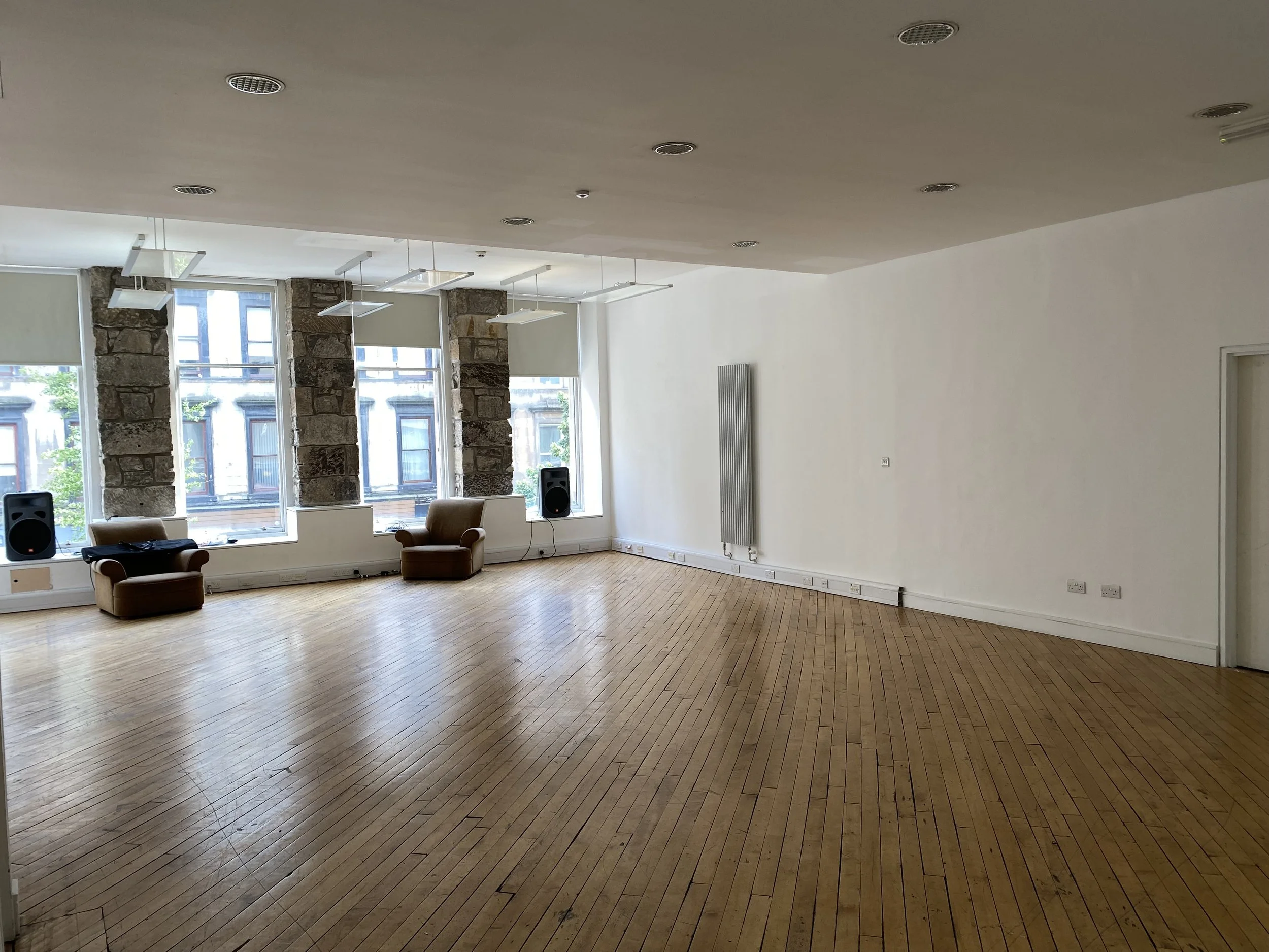Suitable for: Low tech performances; live installations, one on one performances or durational actions. Nothing that will damage the floor.